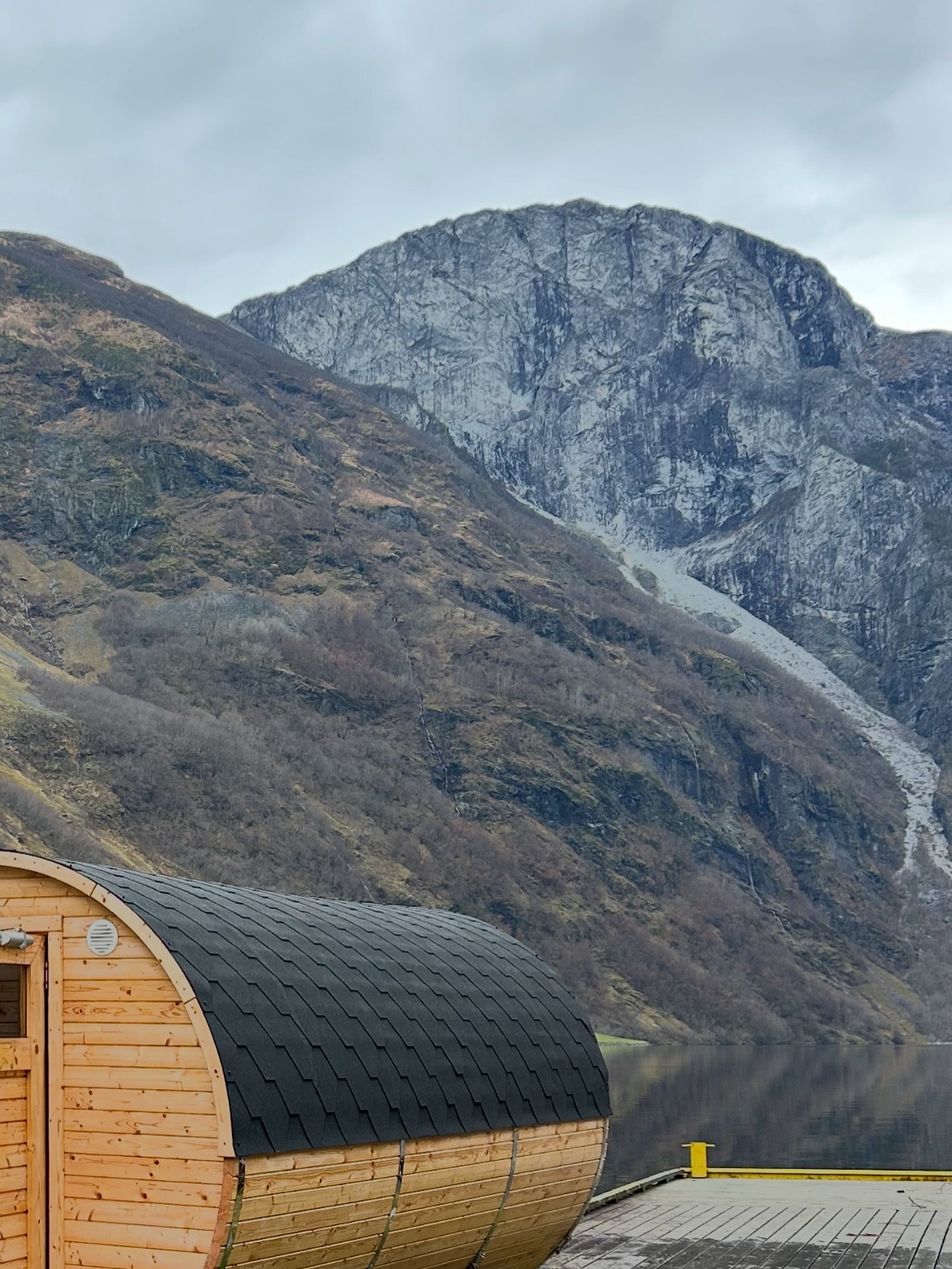 This cute, little barrel sauna is located in a lovely little village, called Bakka, just outside Gudvangen and right on Nærøyfjord. The fjord offers spectacular bathing directly from the dock and breathtaking views.